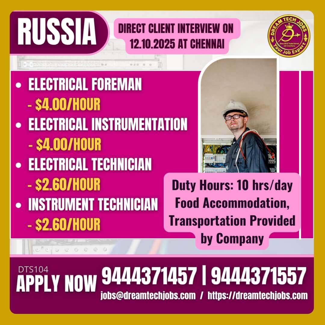 Russia Electrical Jobs 2025 – Direct Interview in Chennai